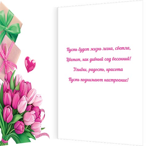 Пусть будет жизнь легка, светла, Цветет, как дивный сад весенний! Улыбки, радость, красота Пусть поднимают настроение!