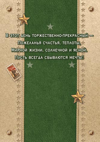 В этот день торжественно-прекрасный — Пожеланья счастья, теплоты, Мирной жизни, солнечной и ясной. Пусть всегда сбываются мечты!