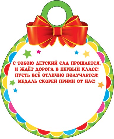 С тобою детский сад прощается, И ждёт дорога в первый класс! Пусть всё отлично получается! Медаль скорей прими от нас!